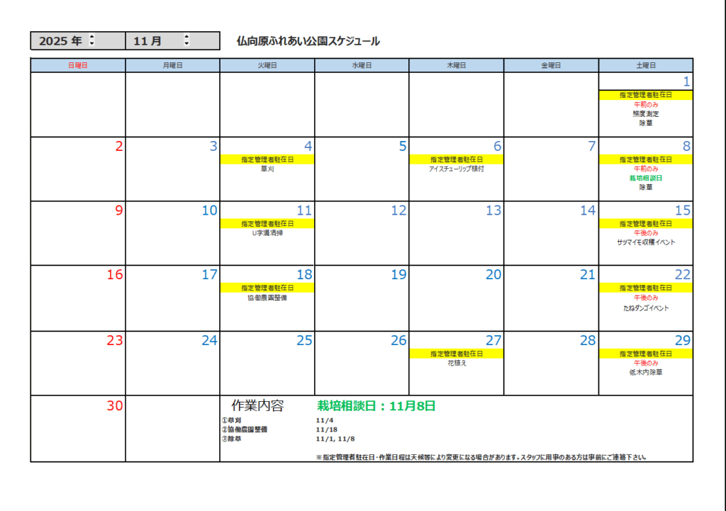 来月の公園スケジュールをアップします。 厳しい残暑が続いていますが、朝晩はすこし秋の気配を感じるようになりました。 農園では夏野菜...